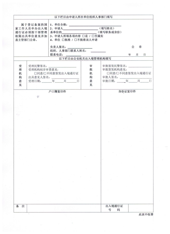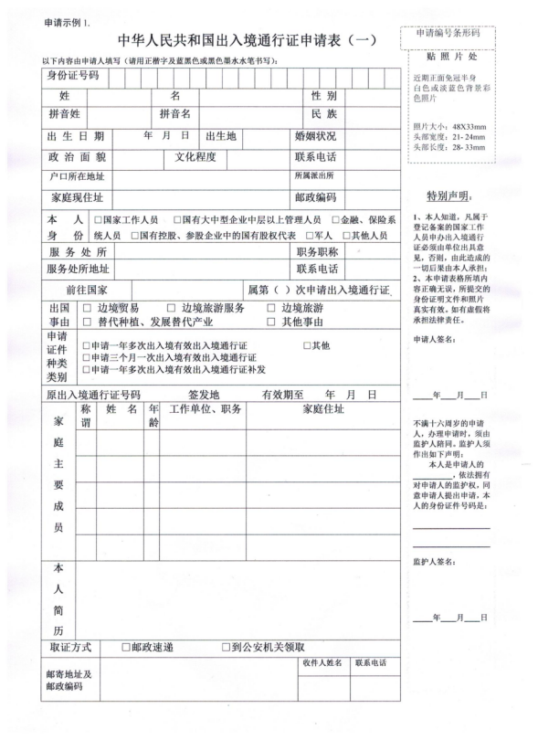 (一) 近期免冠照片一張以及填寫(xiě)完整的《中華人民共和國(guó)出入境通行證申請(qǐng)表(一)》(以下簡(jiǎn)稱(chēng)申請(qǐng)表);
